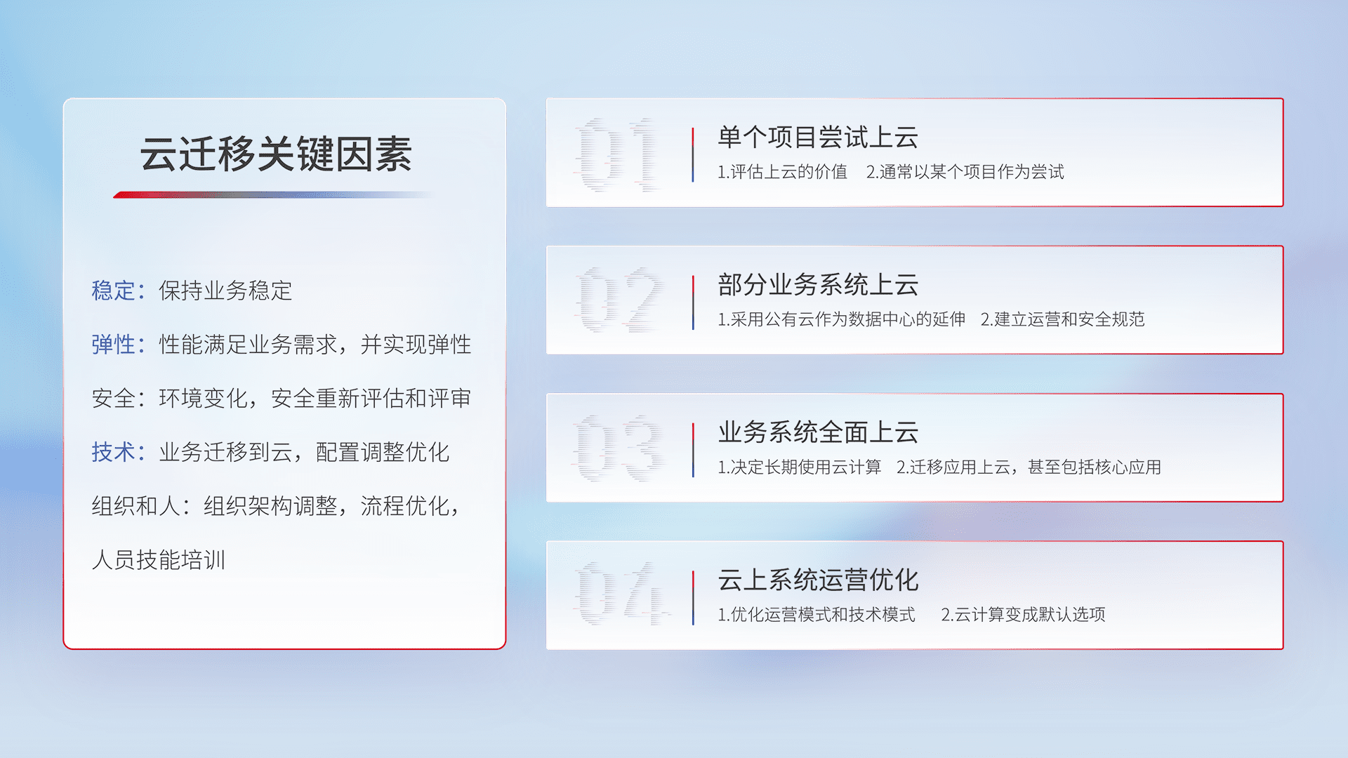 结合实际业务,,,从规划设计、、、云平台选型、、、、云原生改造、、、、数据迁移、、、集成交付,,,,迁移全过程为客户识别最佳上云路径,,,,做好风险识别管理,,,设计网络架构、、、身份权限、、安全审计合规、、、操作审计、、、、日志审计、、、、监控告警策略、、、多站点容灾设计等,,对云上基础设施进行整体规划,,,提升IT治理水平,,以满足弹性、、高可用、、高性能的需求。。