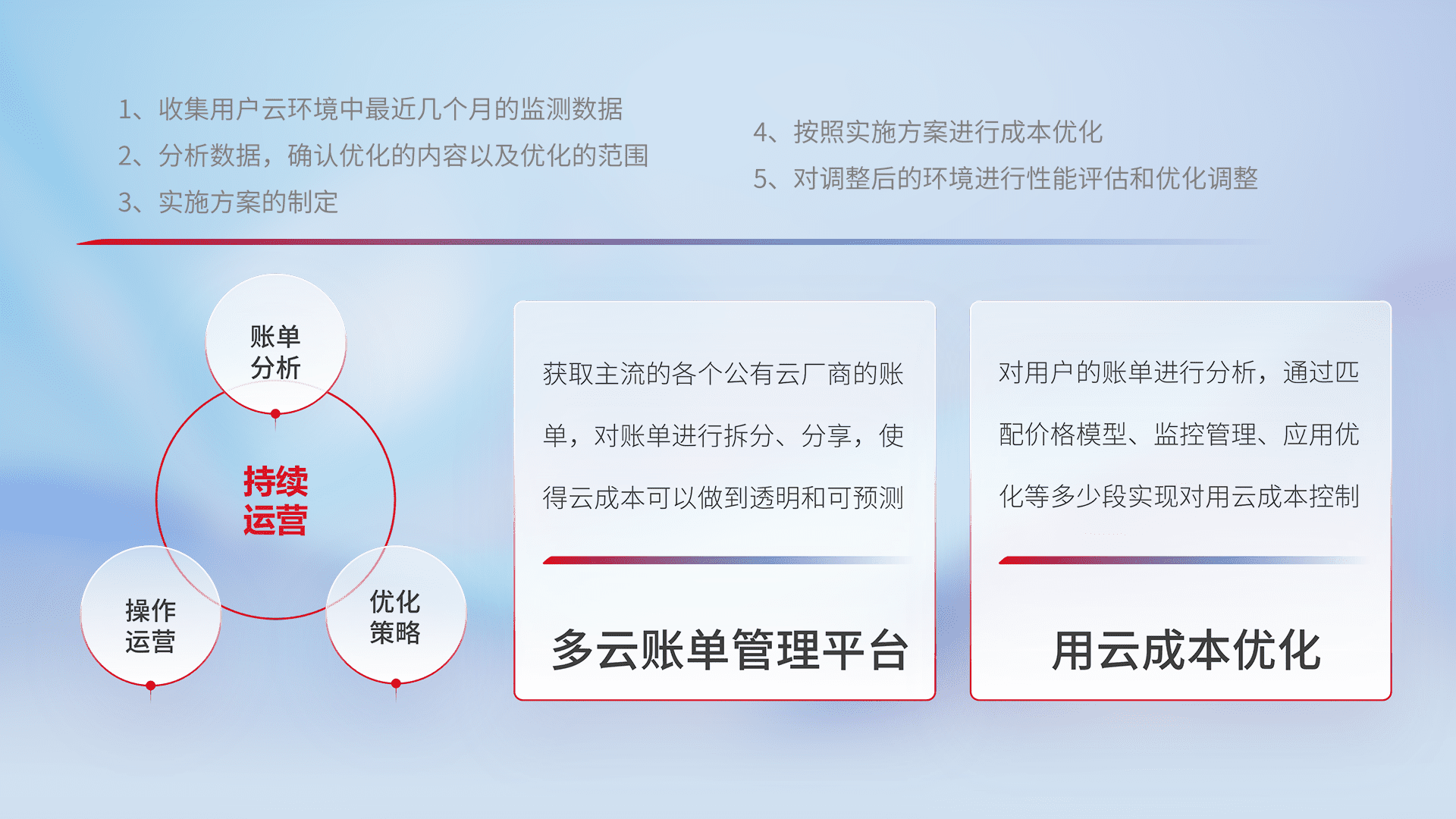 通过多云纳管,,,,以统一的资源数据模型把客户的云资源进行抽象和封装,,,,进而实现对多云资源的统一操作,,保障云资源管理的可靠性、、、、稳定性与可用性。。。量身定制化运维内容,,,,配置、、、、开发运维、、补丁管理、、、备份、、、监控、、、、认证和访问管理、、、、审计和日常巡检等,,,,保障在用云过程中的可靠度,,,稳定度以及高可用率。。。。