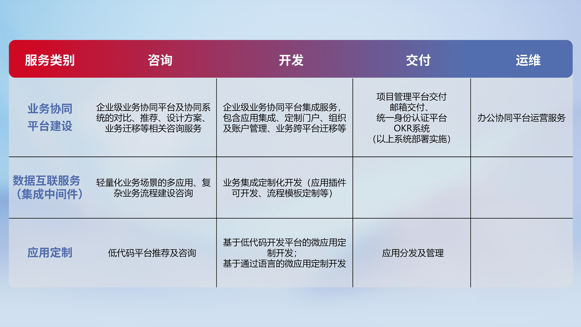 针对钉钉、、、、企微、、、IDaas等平台级产品提供产品的规划、、、、方案、、、、交付、、、、定制化开发等服务,,,实现如统一协同办公、、、智能客户服务、、混合会议管理、、、、智能数据查询、、、等业务场景,,,实现数字化转型。。。